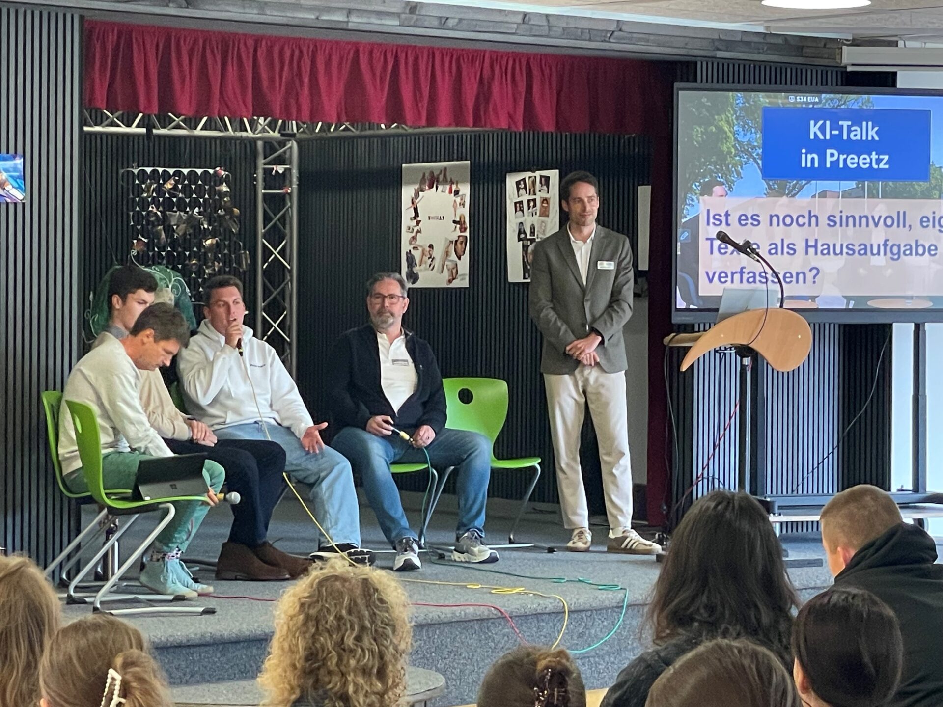 Vom 2. Bis 6. Juni 2025 fand an der Kührender Straße die zweite Digitale Woche für die Abteilungen BG und SP statt. Die „DiGiWo“ startete am Montag mit einem Vortrag von Markus Allner (SHIBB) der einen Querschnitt durch das Thema KI präsentierte. Vom Dienstag bis zum Donnerstag bot der Moodle-Kurs den Lehrkäften und Lernenden die Möglichkeit sich mit verschiedenen Themen rund um die KI auseinanderzusetzen. Die Themen wurden durch die Arbeitsgruppe Digitale Woche so aufbereitet, dass eine Einbindung in den Unterricht, aber auch eine separierte Betrachtung des jeweiligen Tagesthemas möglich war. Am Freitag fand in der Aula eine Talkrunde bzw. Podiumsdiskussion statt. Markus Allner war erneut zu Gast und moderierte gekonnte durch die 60 minütige Veranstaltung. In der Runde auf der Bühne waren zwei Schüler, zwei Lehrkräfte und ein Experte aus der Medienberatung des SHIBBs vertreten. Neben den Beiträgen aus der Runde auf der Bühne nutzen auch die Zuhörer aus dem Publikum die Chance ihre Meinung per Wortmeldung oder über Oncoo zu den gestellten Fragen und Thesen zu äußern.