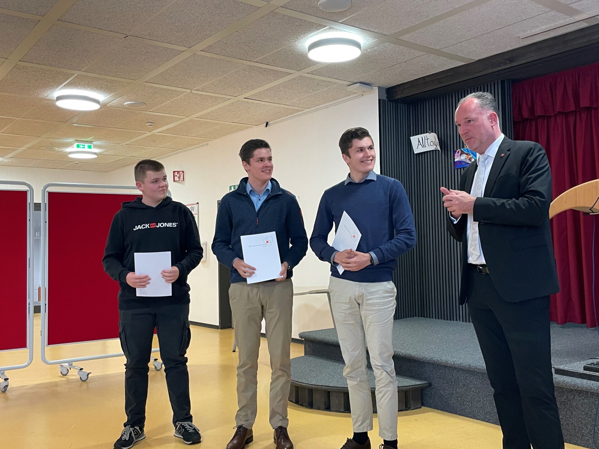 Bei der Preisverleihung bedankten sich Landrat Björn Demmin und Schulleiter Torge Indinger bei allen Teams und würdigten alle Schülerinnen und Schülern für ihr hohes Engagement beim diesjährigen Gründerpreis.