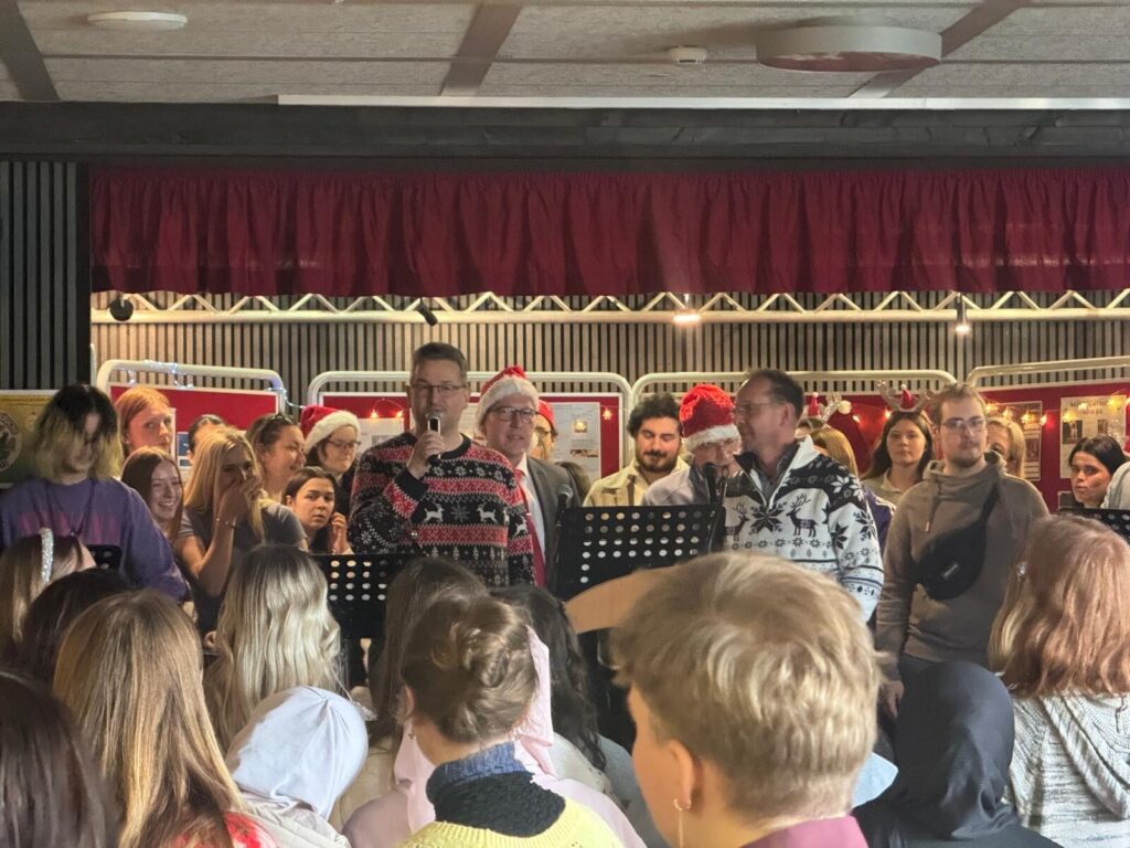 Für eine besonders weihnachtliche Stimmung sorgten viele Schülerinnen und Schüler, die mit Instrumenten auftraten und die Lieder musikalisch unterstützten. Zudem erschienen zahlreiche Teilnehmende in festlicher, weihnachtlicher Kleidung, was zur feierlichen Atmosphäre beitrug.